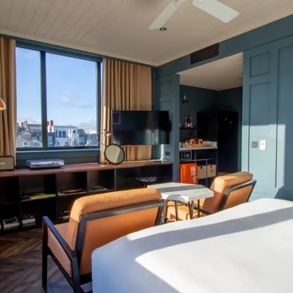 The Dean also offers luxury hotel suites which are perfect for an intimate get together with friends or family, with plenty of space to play and sweet additions such as our freestanding baths, a separate living room, vintage guitar and a balcony which overlooks Dublin City. The Penthouse suite at The Dean is one of Dublin’s most luxurious accommodation options and would turn your staycation this winter into one of the best holidays you have ever had. Our penthouse suite includes two huge bedrooms, handcrafted furniture, cool art, freestanding bath, ensuite with a power shower, a gas fireplace, turntable, poker table, a foosball table and so much more.