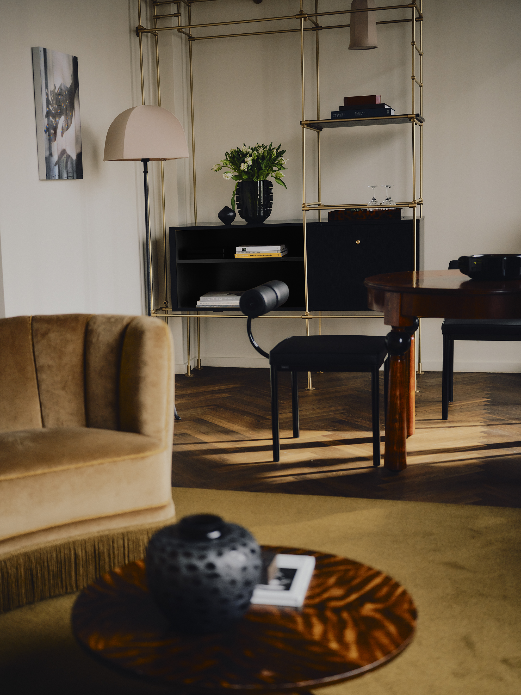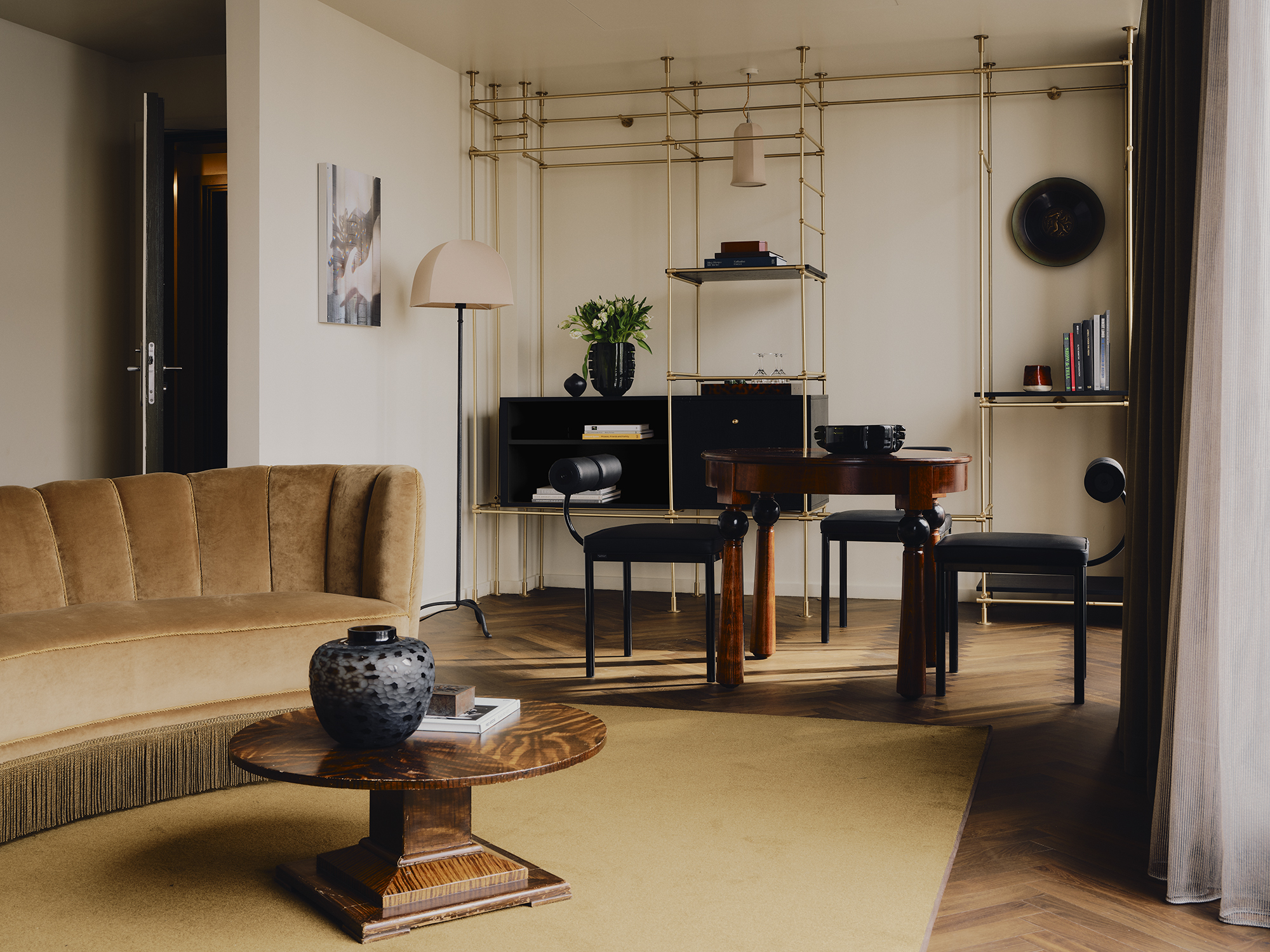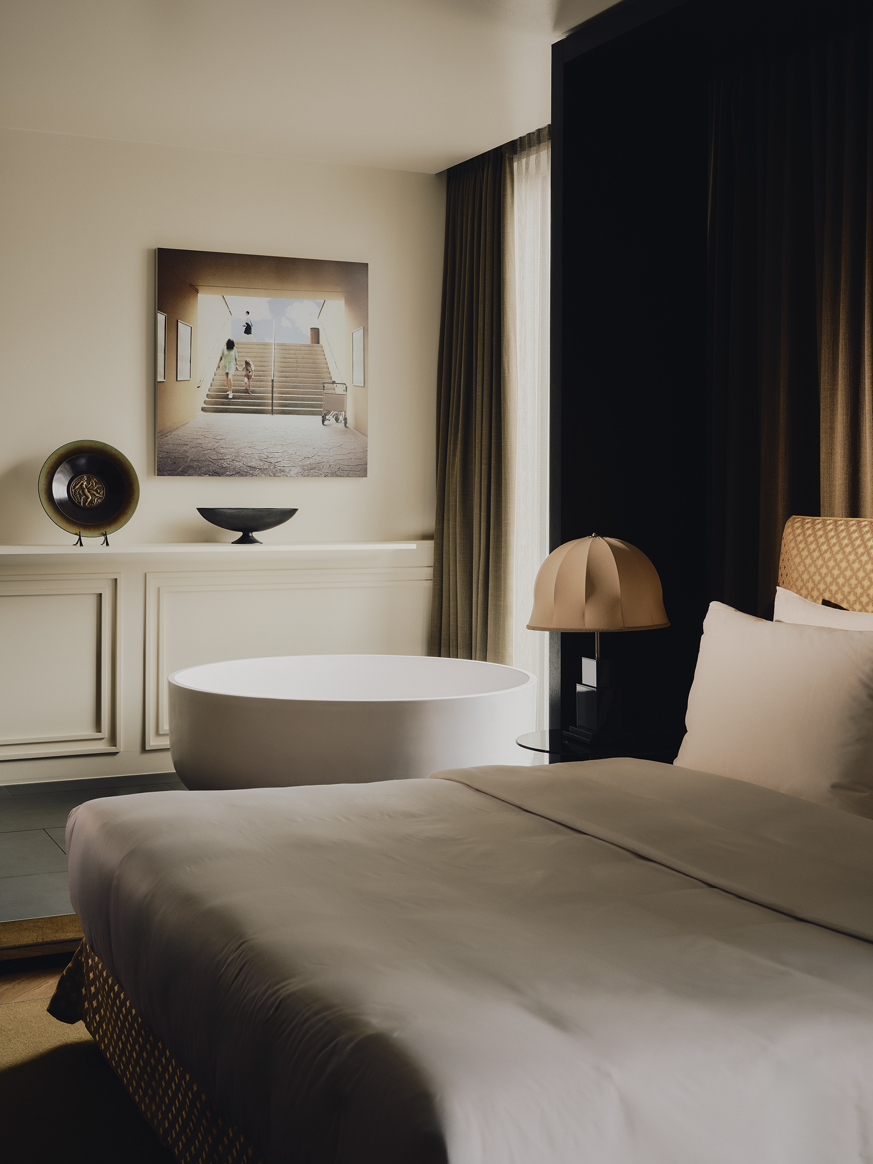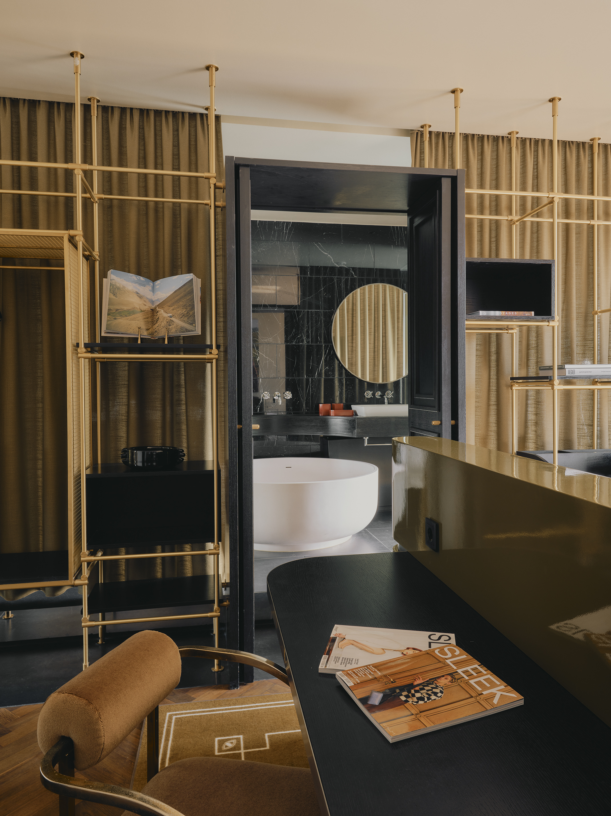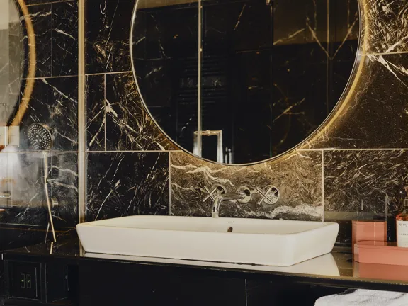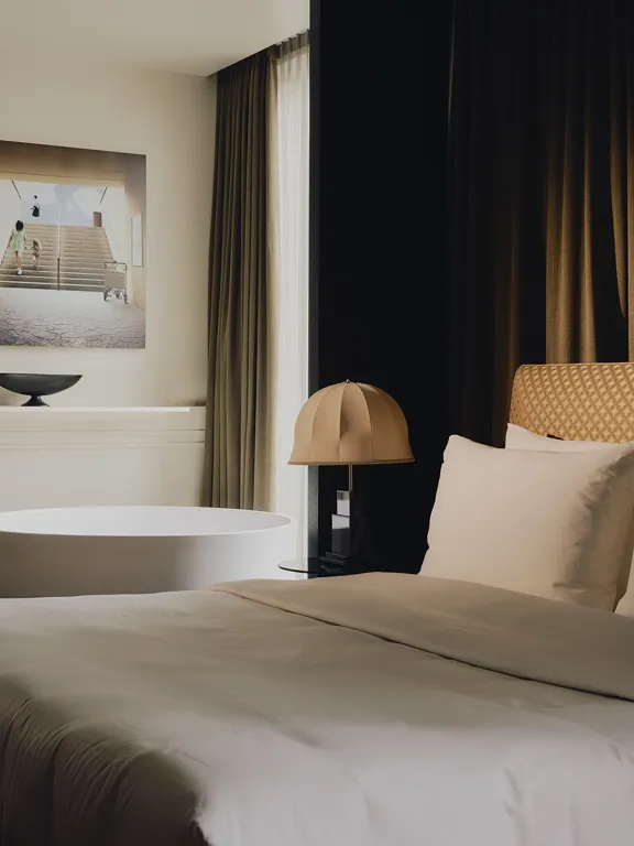 Big on space, style and character. This is our 73-sqm suite with a king-size bed, separate living room, marble bathroom, free-standing bathtub, walk-in rain shower, and separate half bathroom. Sleeps three.