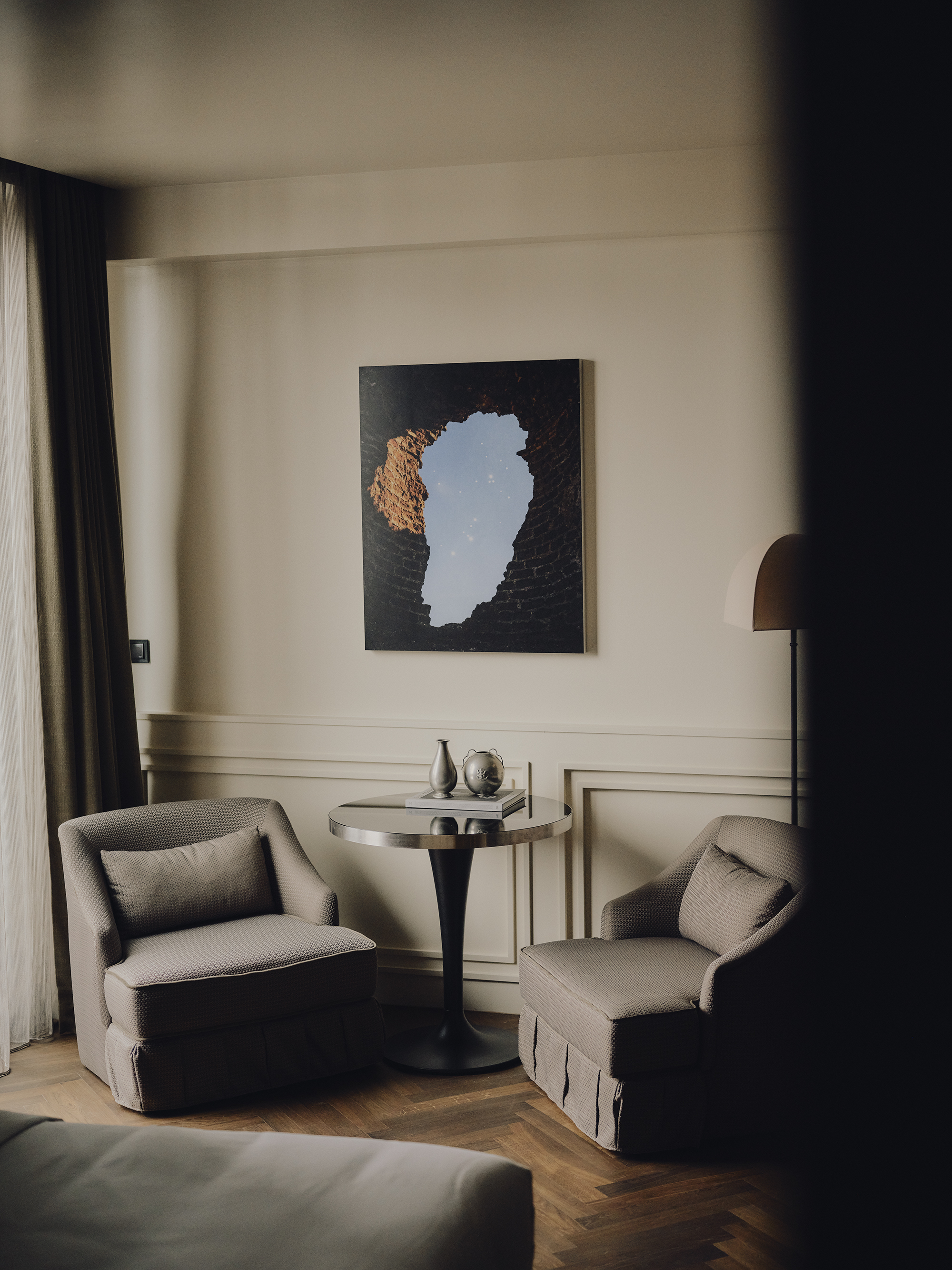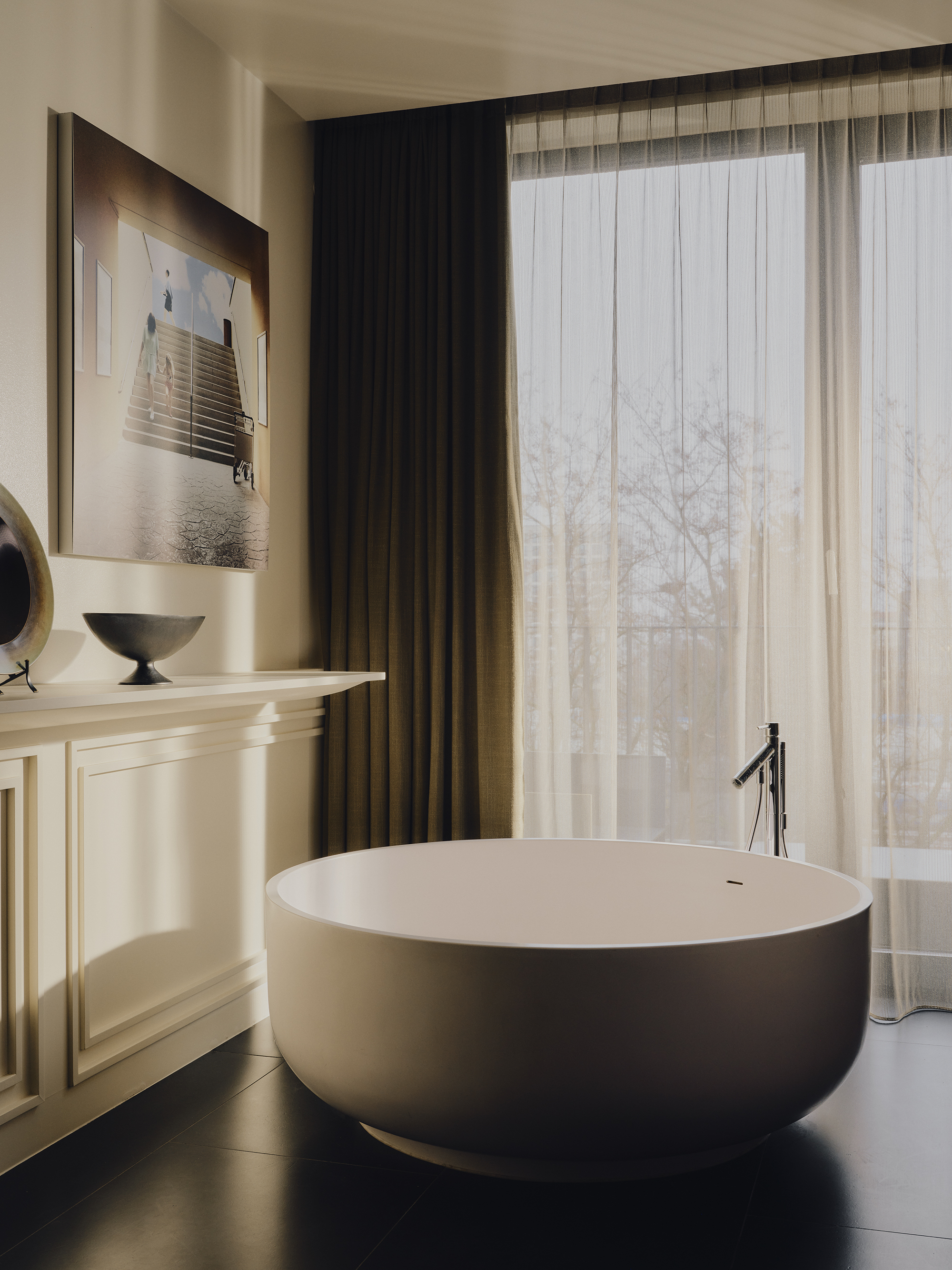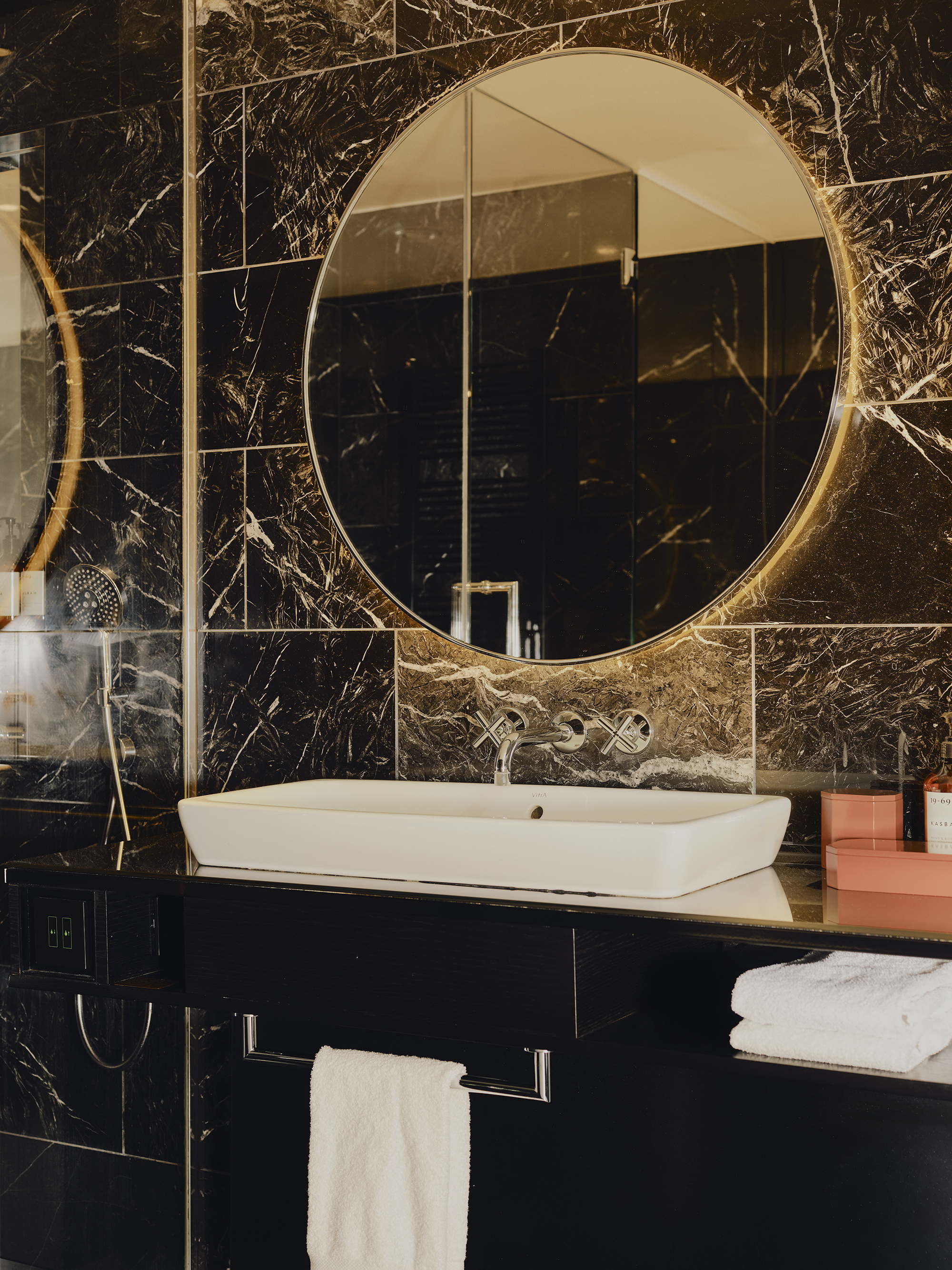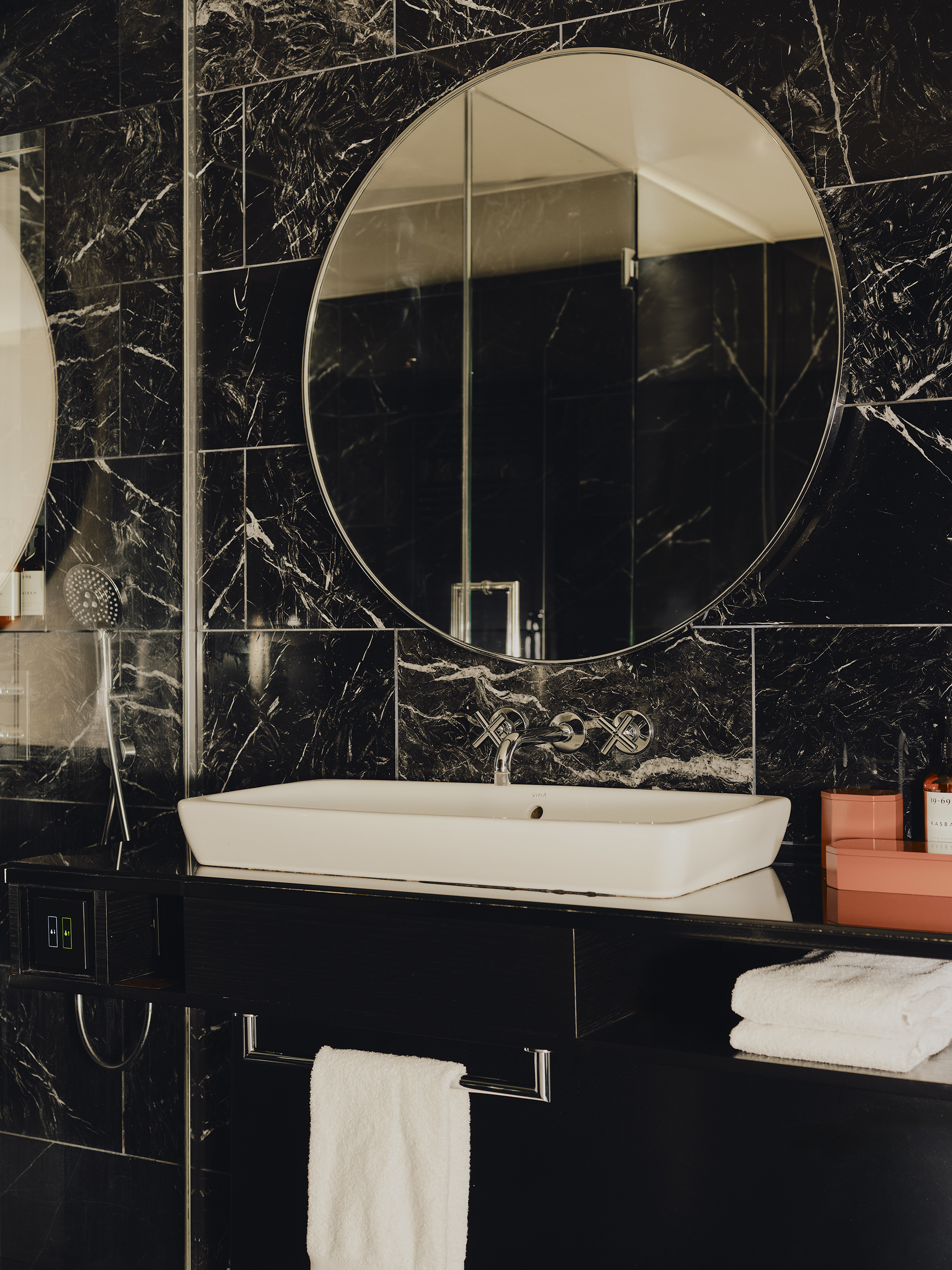 Big on space, style and character. This is our 73-sqm suite with a king-size bed, separate living room, marble bathroom, free-standing bathtub, walk-in rain shower, and separate half bathroom. Sleeps three.