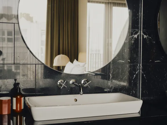 For those who appreciate a skyline view. A little more space with a view of the city, a large, comfy bed, room to lounge, and a marble bathroom with walk-in rain shower. Sleeps two.